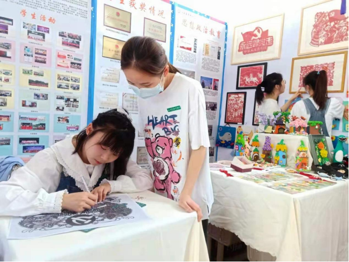 今年是建党一百周年,我系教师彭彤彤老师紧紧围绕建党100周年主题,在手工课上巧妙地融入思政元素,教授同学们制作剪刻纸作品,为建党一百周年献礼。剪刻纸是中国传统剪纸艺术,彭老师将剪刻纸与课堂主题相结合,在专业课“思政教育”常态化方面做了很好的示范。此外,今年5月,我系彭彤彤老师与王一老师还带领学生参加了2021年江西省职业教育活动周暨南昌市职业教育活动月,为现场观众呈现了琳琅满目的剪刻纸、纸浆画、钩针编织、手工香包等作品,反响热烈。