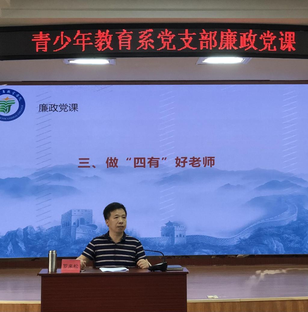 为深入学习贯彻习近平总书记关于全面从严治党重要思想和论述,根据学校《关于加强新时代廉洁文化建设的意见》要求,进一步推进本支部党风廉政建设,筑牢广大党员干部拒腐防变思想防线,提高廉洁自律意识,自觉做到讲党性、重品行、守规矩、作表率,6月10日下午,学校党委书记罗来松给青少年教育系党支部全体党员讲授专题廉政党课,党课的主题是“回眸 奋进 做四有好教师 育时代新人”。