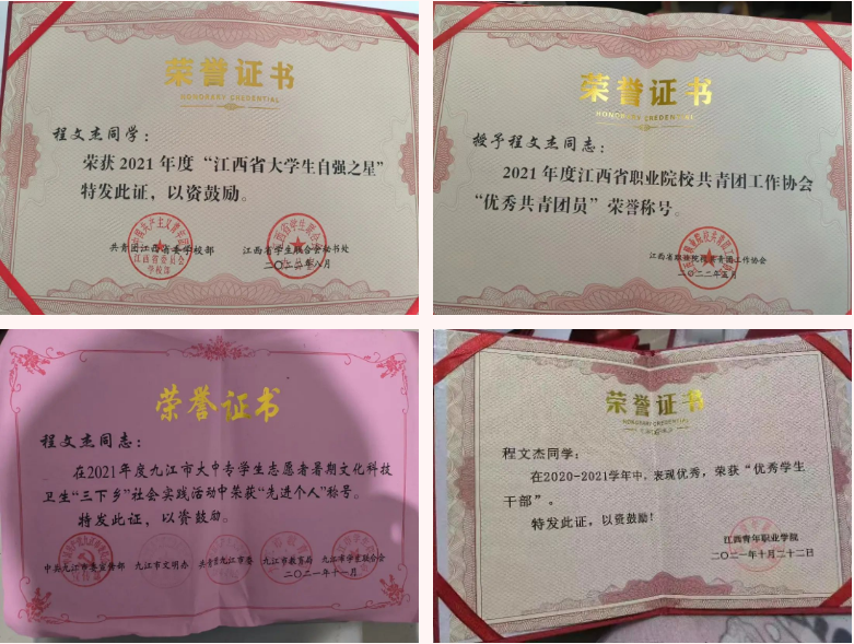 程文杰同学,荣获2021年度“江西省大学生自强之星”;荣获2021年度江西省职业院校共青团工作协会“优秀共青团员”荣誉称号;在2021年度九江市大中专学生志愿者暑期文化科技卫生“三下乡”社会实践活动中荣获“先进个人”称号;在2020-2021学年中表现优秀,荣获“优秀学生干部”;荣获江西青年职业学院第十届“自强之星”;荣获江西青年职业学院2021年度“优秀共青团干部”称号;在2021-2022年度江西青年职业学院青少年教育系学生会表现突出,被评为“优秀干部”;在江西青年职业学院2020年度表现突出,荣获“优秀共青团干部”。